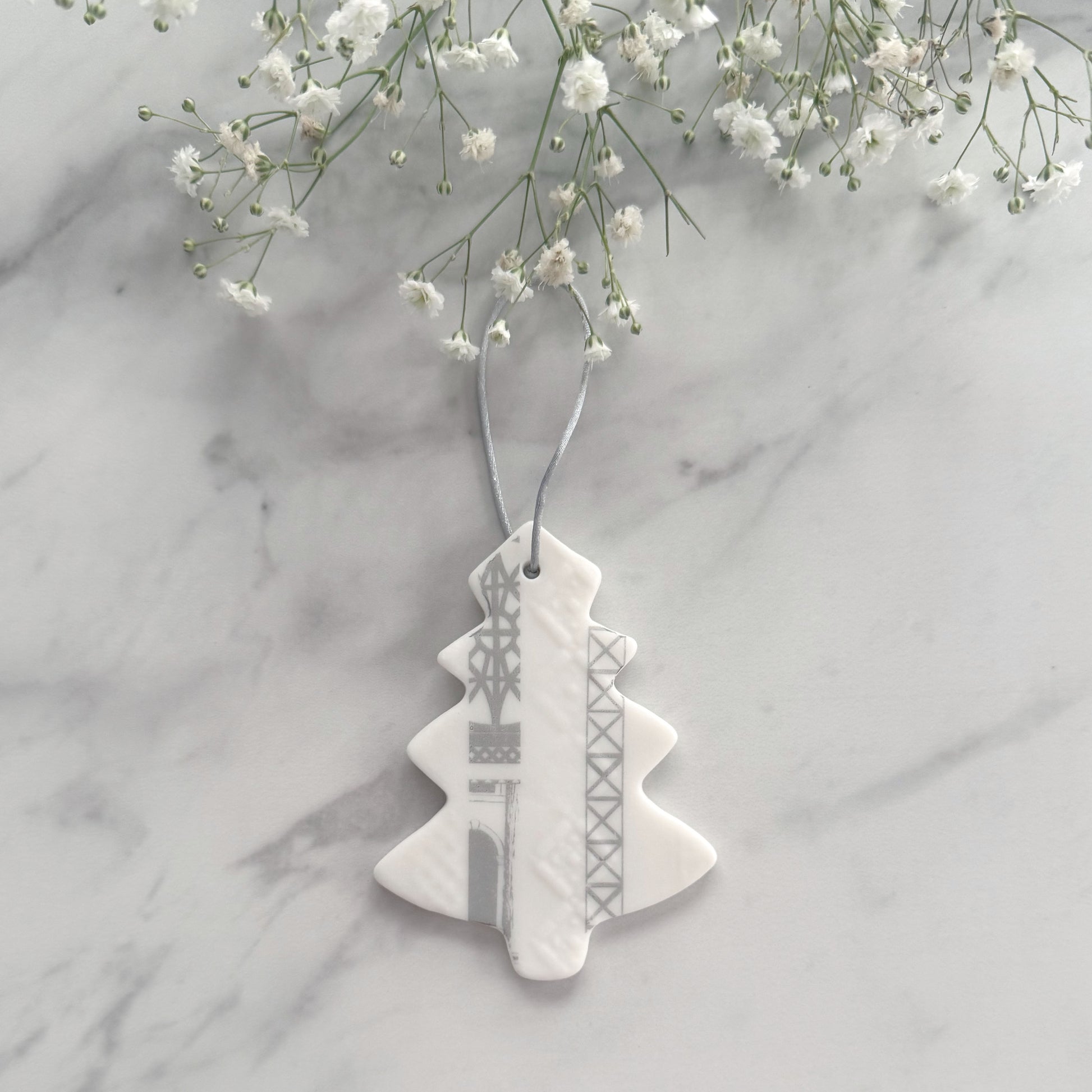 A handmade porcelain Christmas Tree decoration with embossed textures and transfer prints.