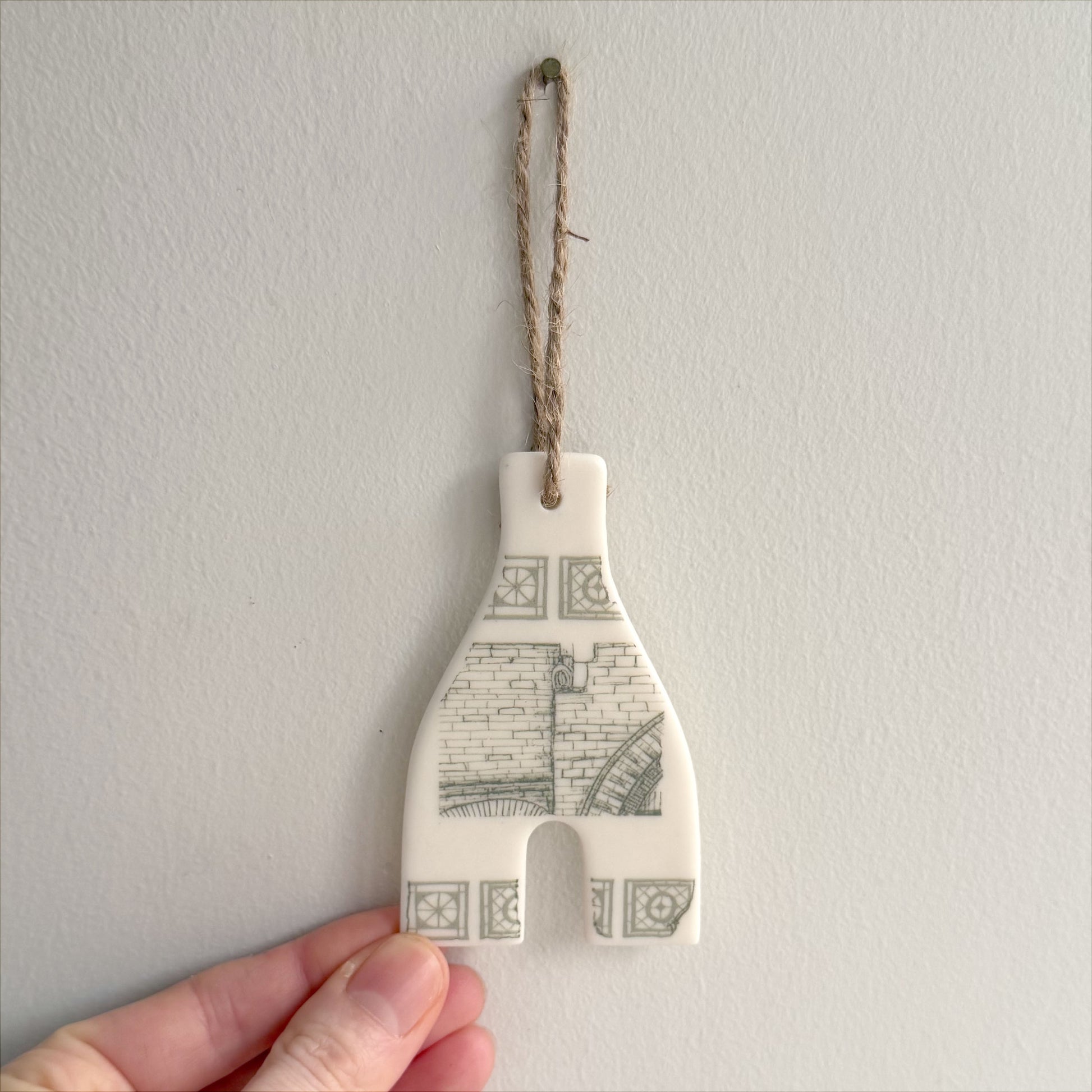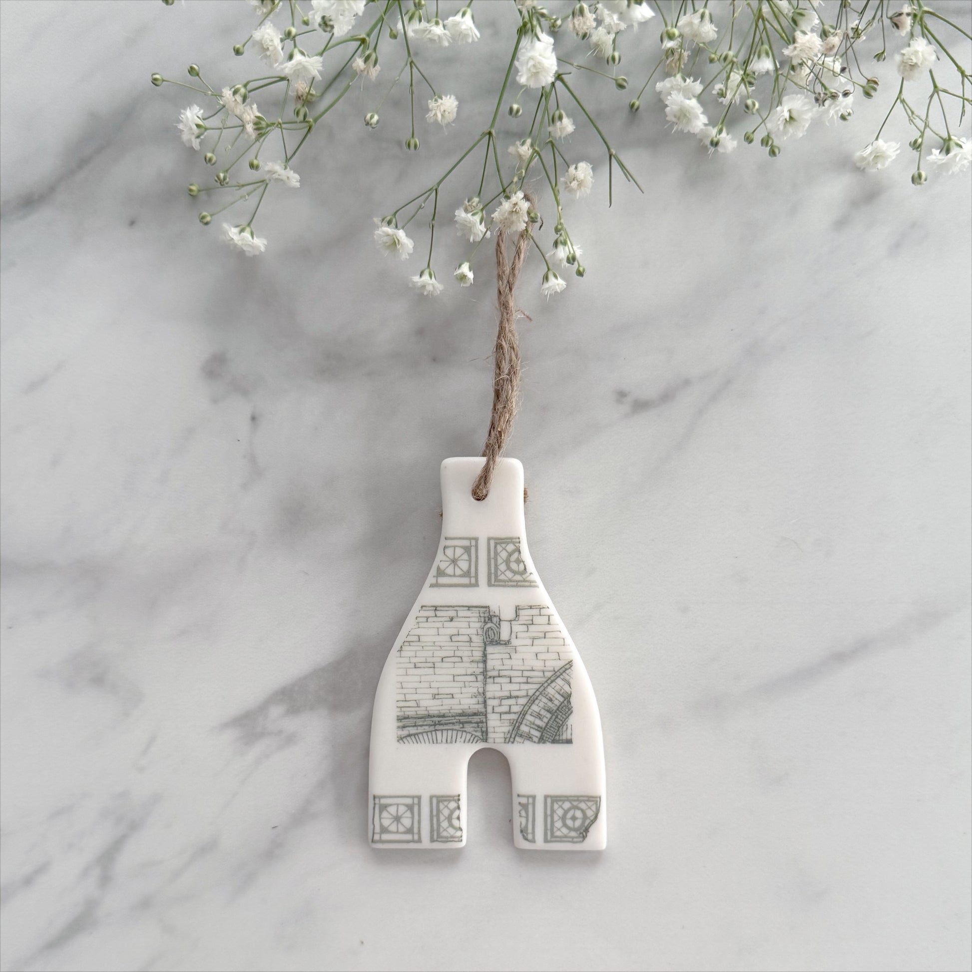 Handmade Porcelain Bottle Kiln Decoration (Design 4) with transfer prints.