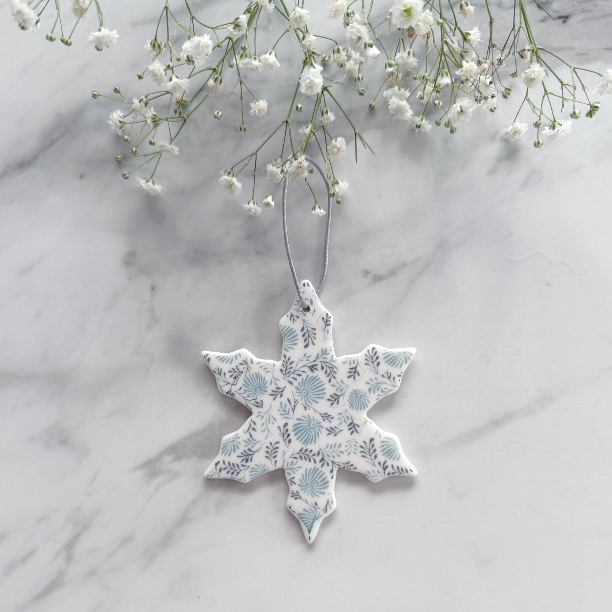 Handmade Porcelain Snowflake decoration with hand drawn floral transfer print.