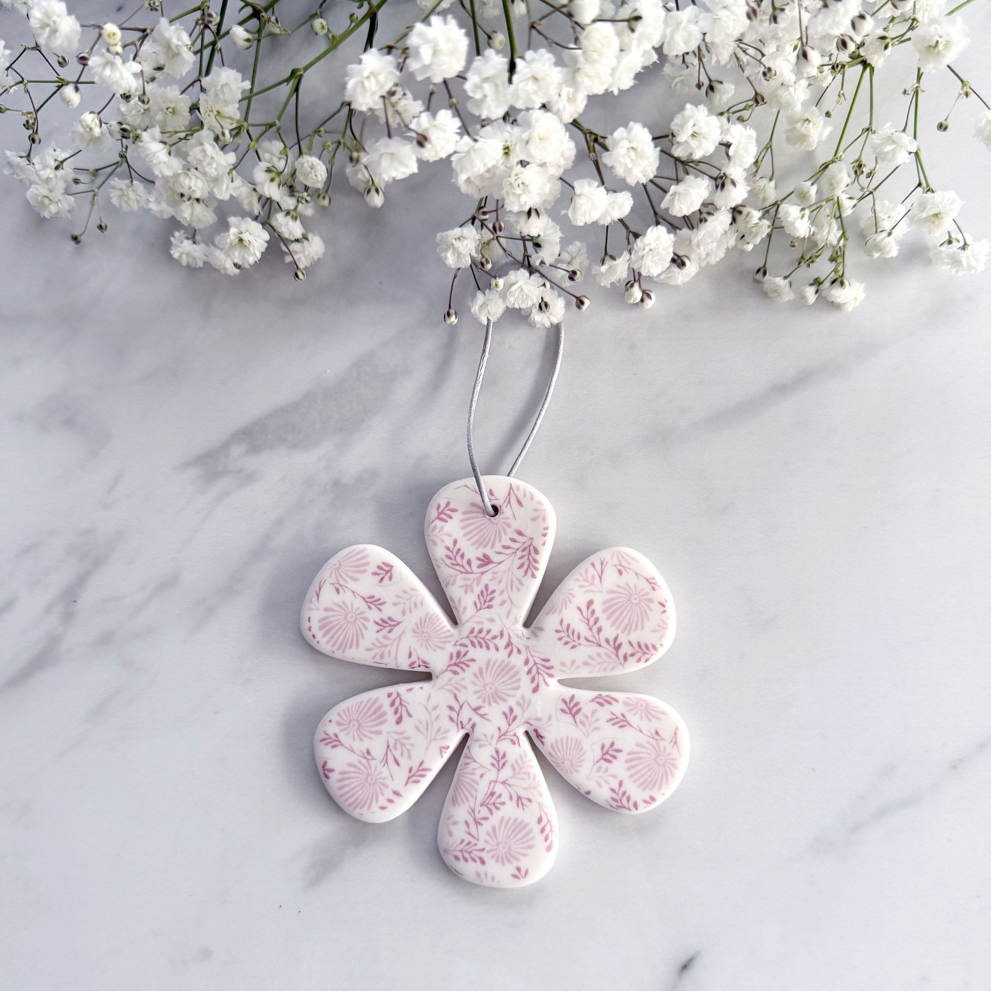 Handmade Porcelain Flower decoration with hand drawn floral transfer print.