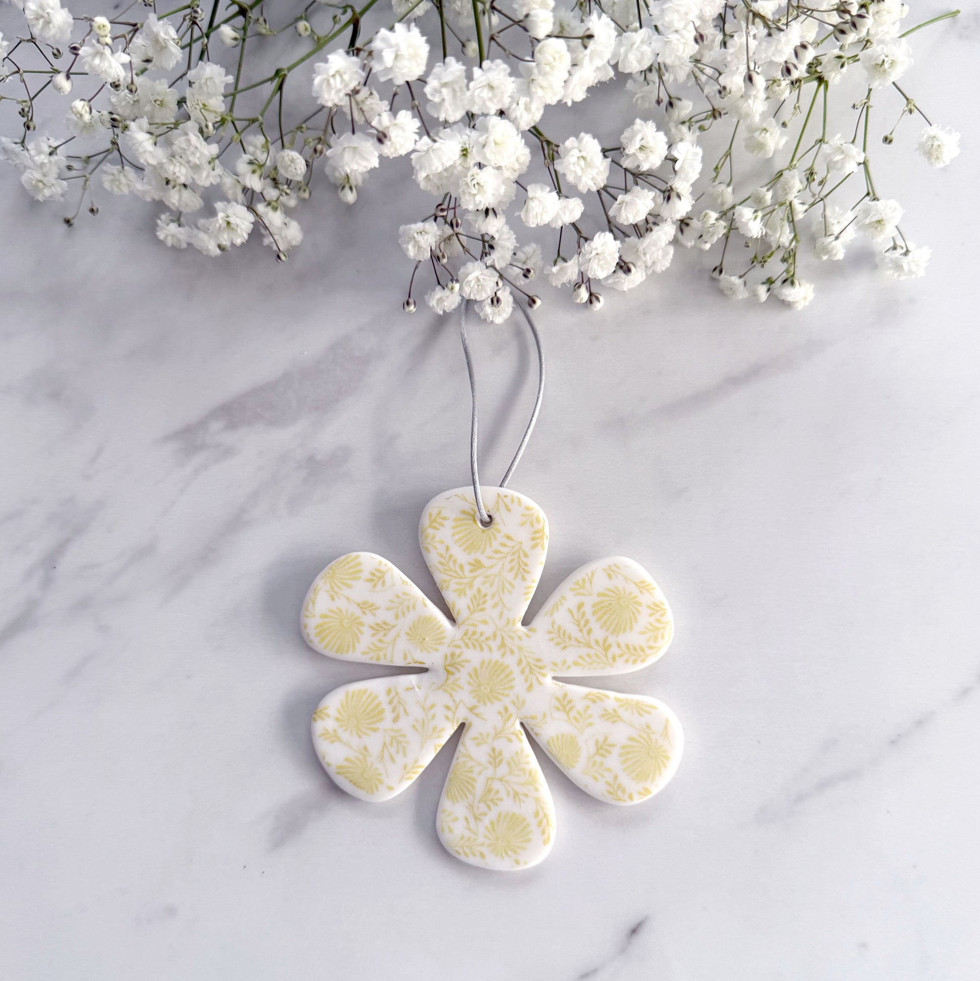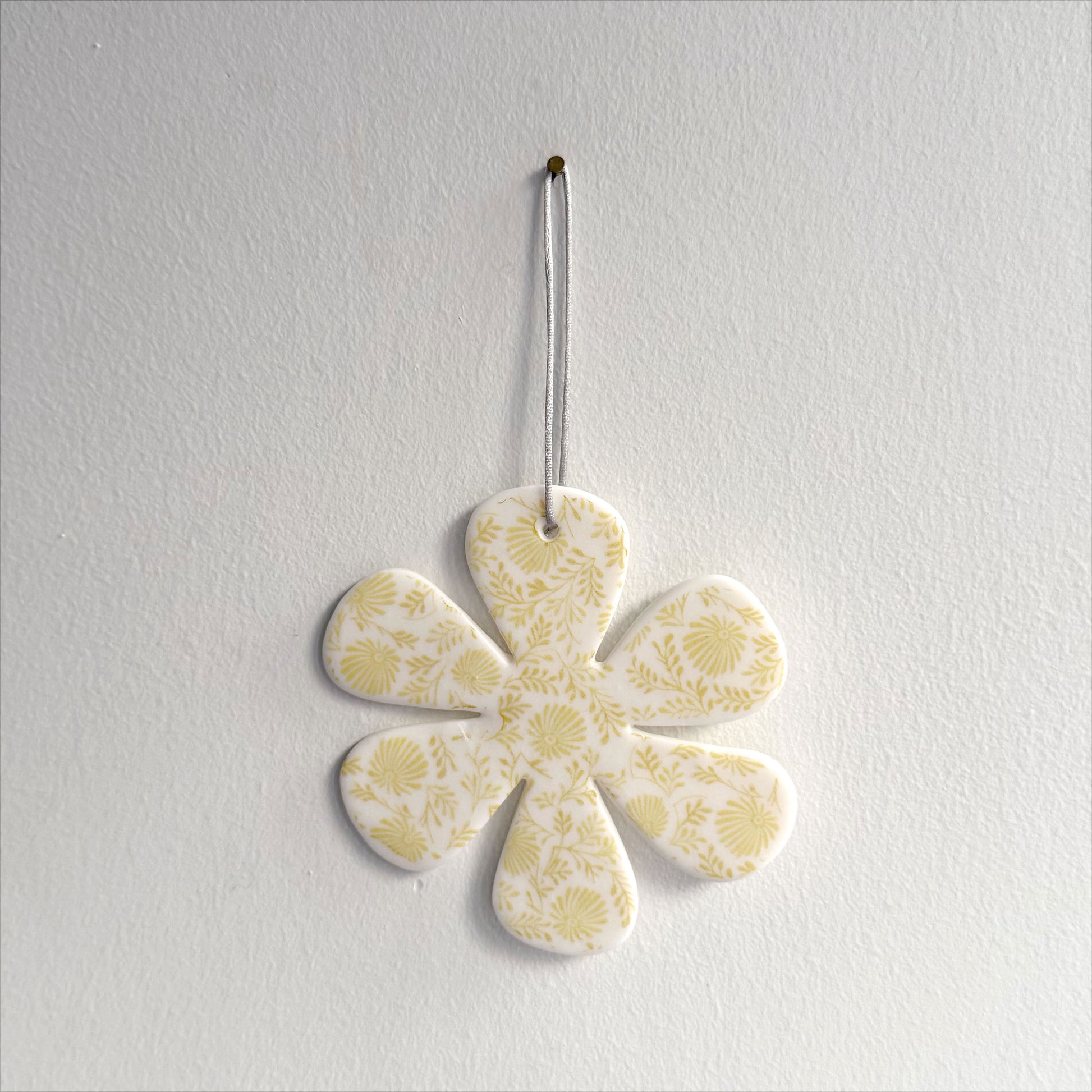 Handmade Porcelain Flower decoration with hand drawn floral transfer print.