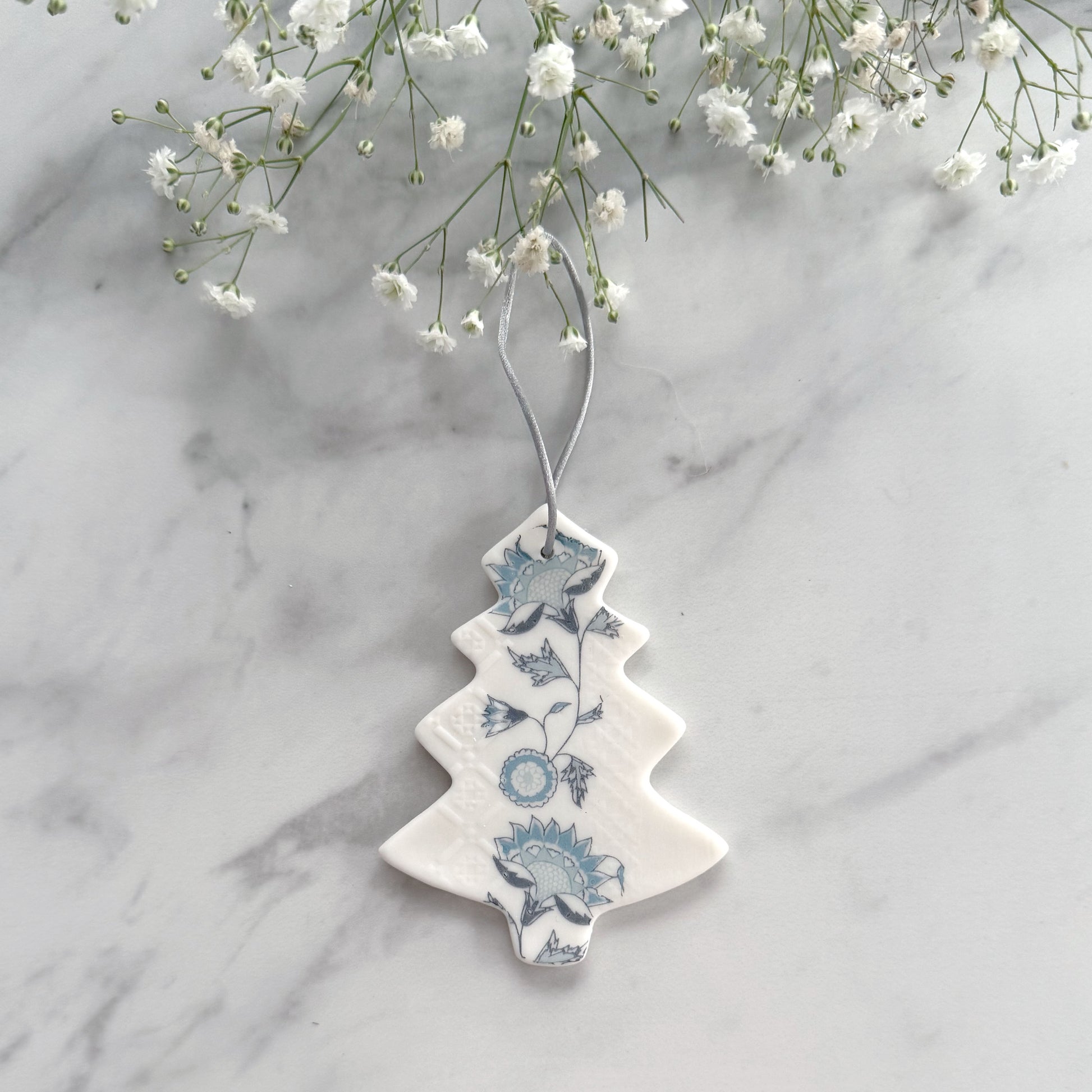 A handmade porcelain Christmas Tree decoration with embossed textures and transfer prints.