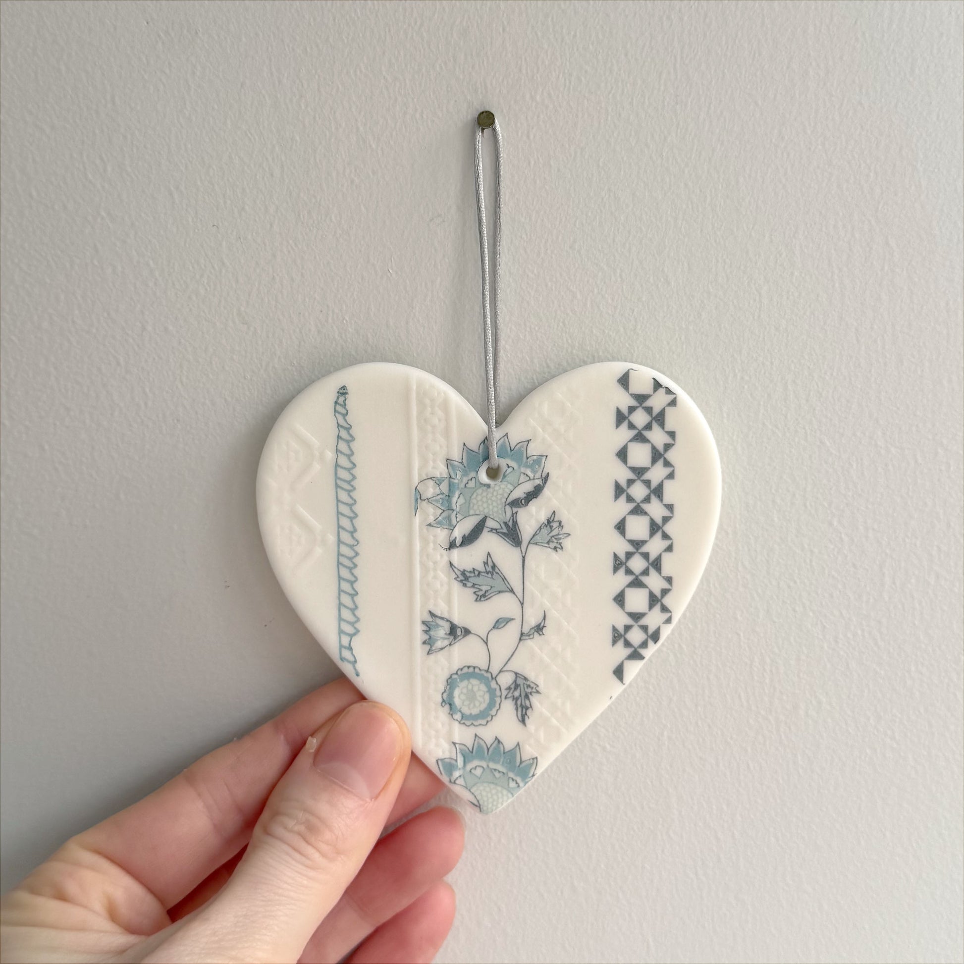 Handmade Porcelain Heart decoration with embossed textures and transfer prints.