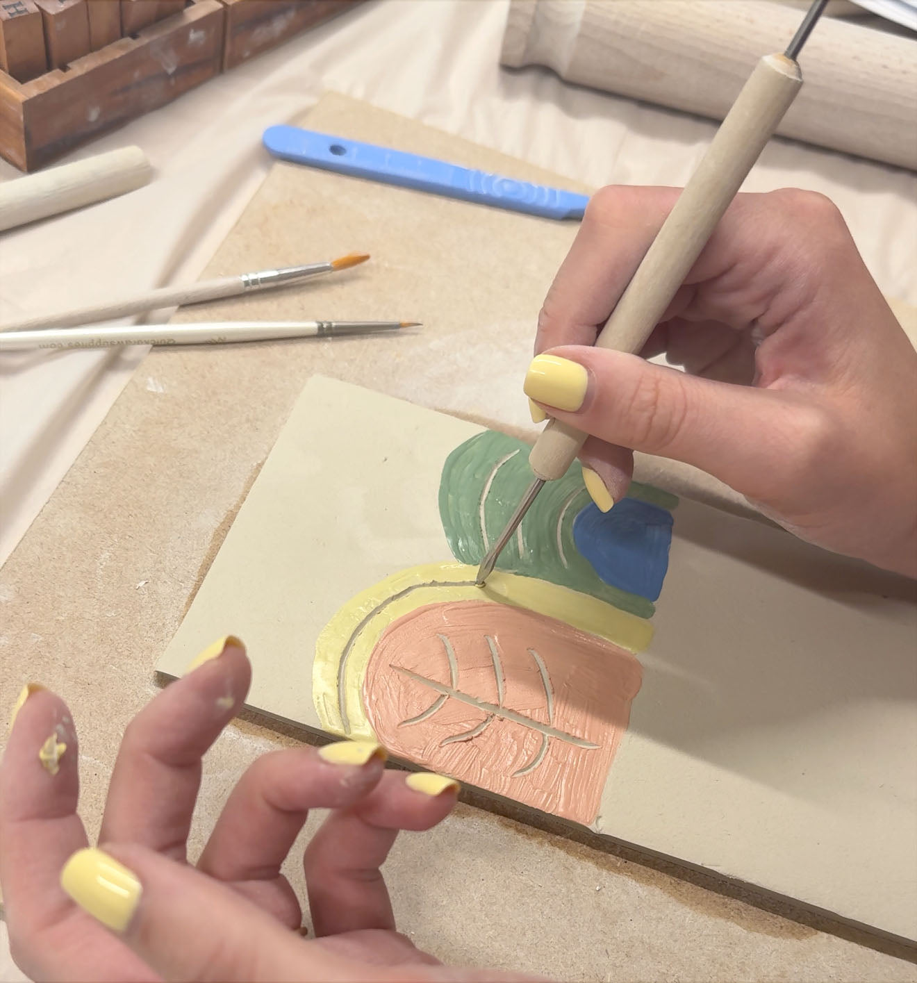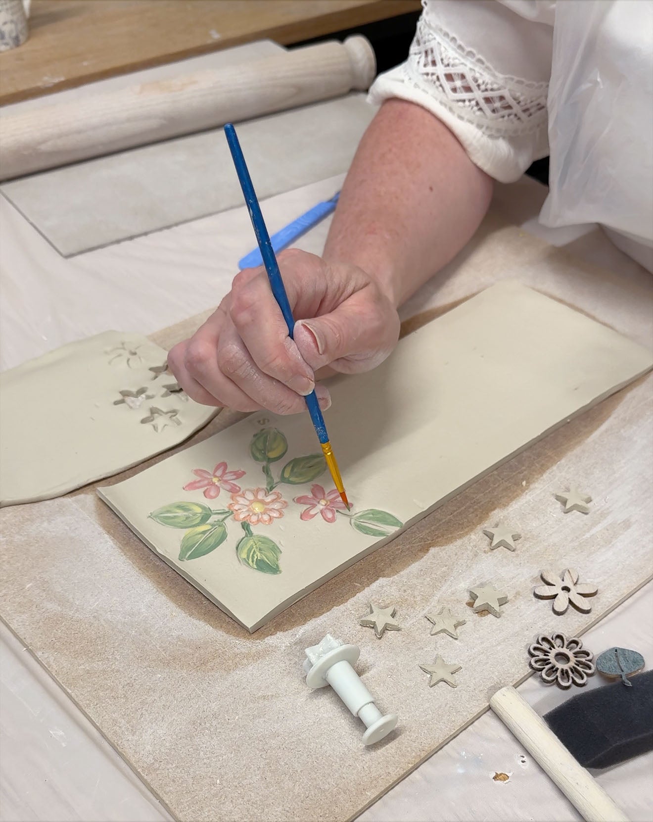 You will be able to practise the different surface decoration techniques onto a couple of porcelain tiles/ plaques or coasters before creating your pocket. These will be fired with your pockets.