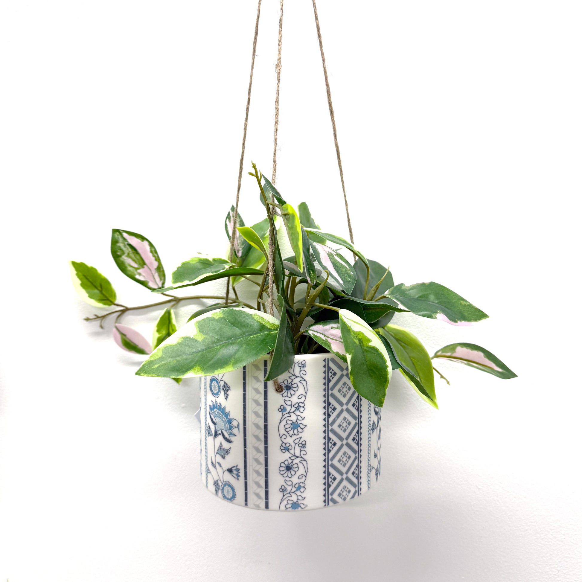 A handmade hanging planter pot with surface transfer print design, inspired by the fusion of traditional patterns and styles from elements of Eastern floral prints and textiles.